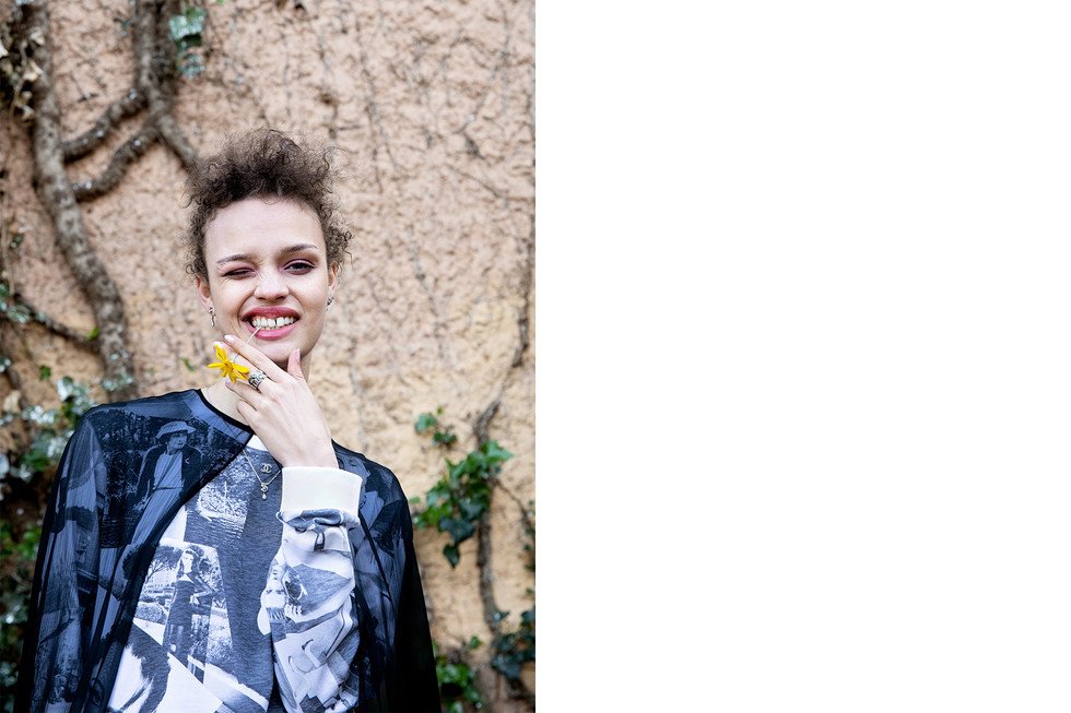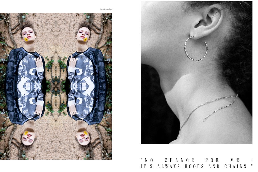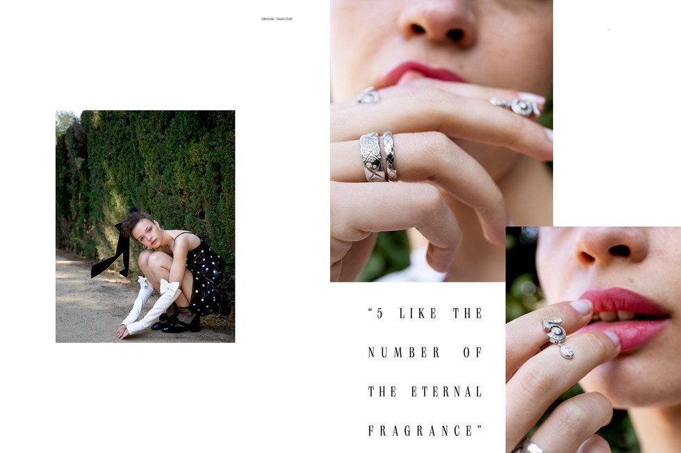Eternal N°5 transformable earrings, Eternal N°5 necklace and Eternal N°5 ring paired with a quilted Coco Crush small ring, all in 18K white gold and diamonds. styled together with a long sleeve cotton t-shirt and a cape in black silk chiffon