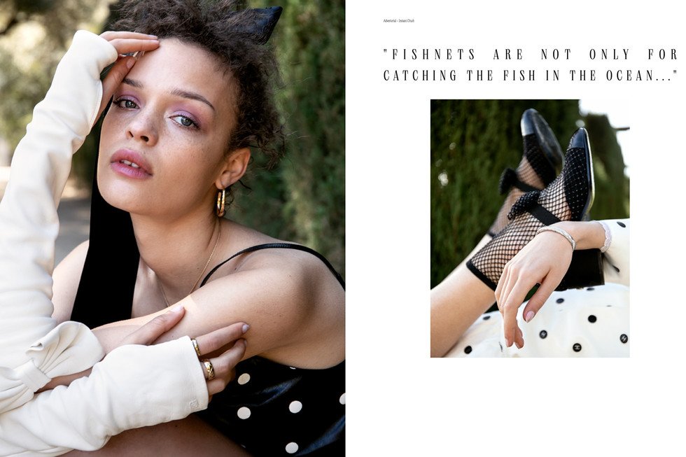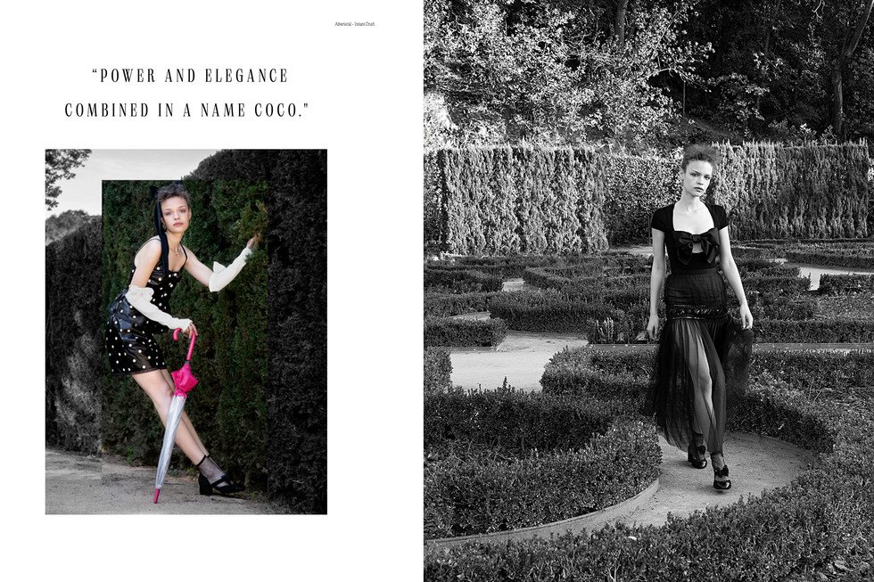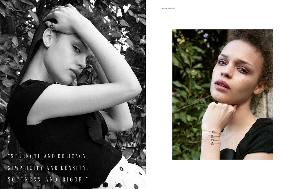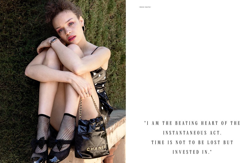 Styled together with a matching set of black leather and polka dots with trimmed lace finish, white long finger gloves in leather, booties in black strassed fishnet, suede and patent leather, and a mini CHANEL 22 in black calfskin. Coco Crush quilted motif hoop earrings in 18K Beige Gold and a small Coco Crush Toi et