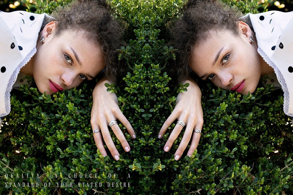 Eternal N°5 ring in 18K white gold and diamonds, paired with a quilted motif,