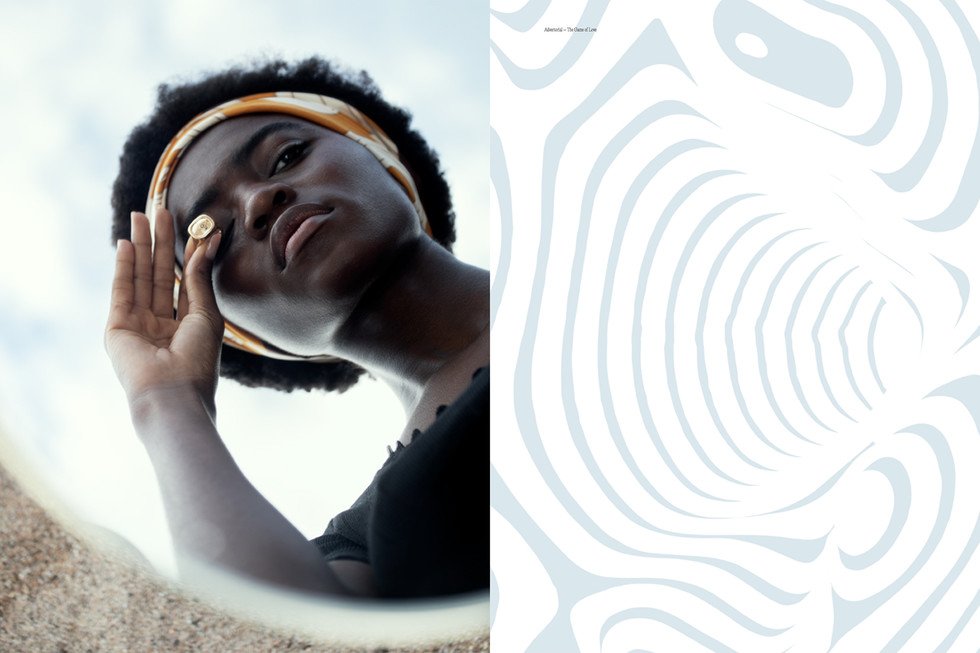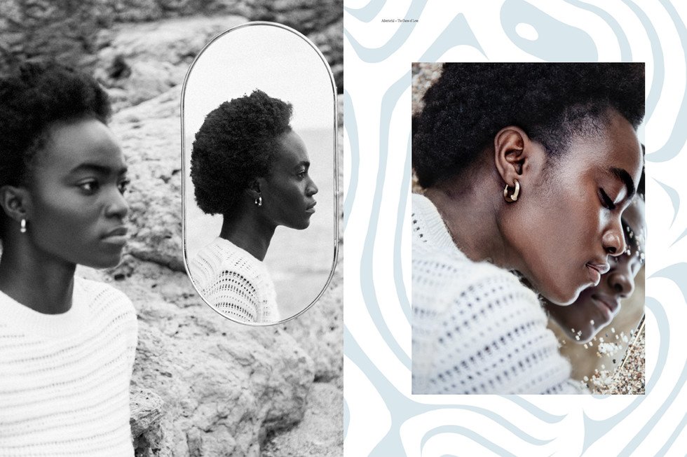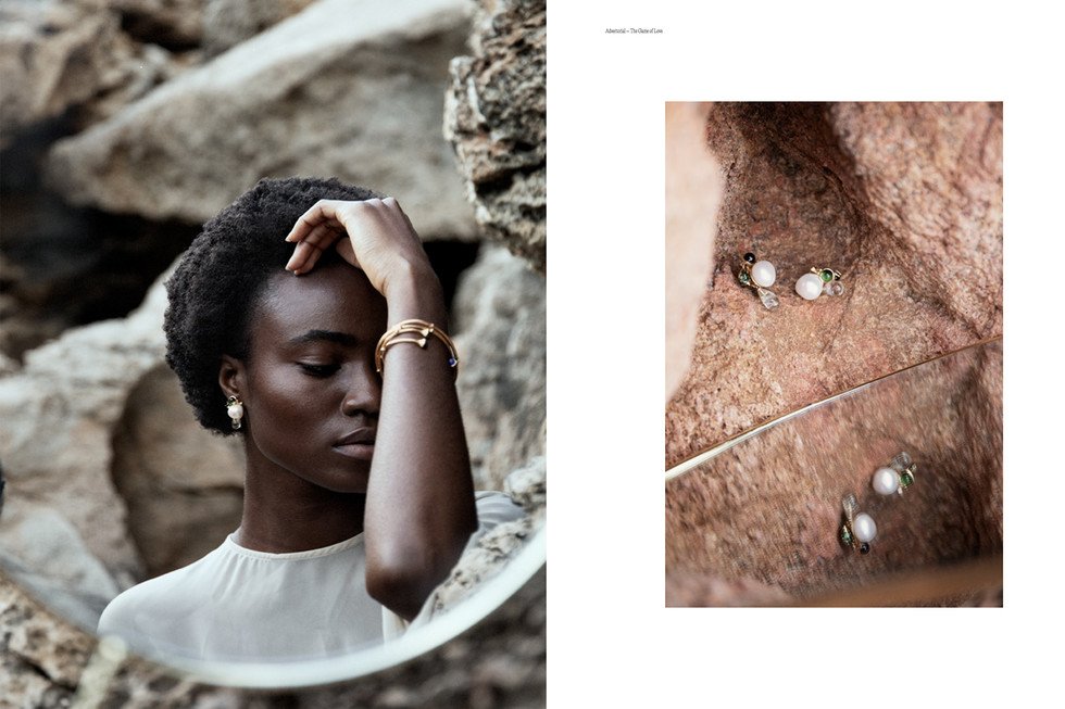 Ole Lynggaard Boho Stud earrings with pearls, green tourmaline and diamonds and a Nature Bangles one in sanitized 18K rose gold and yellow gold paired with Nature Bangles in topaz and one with green tourmaline.