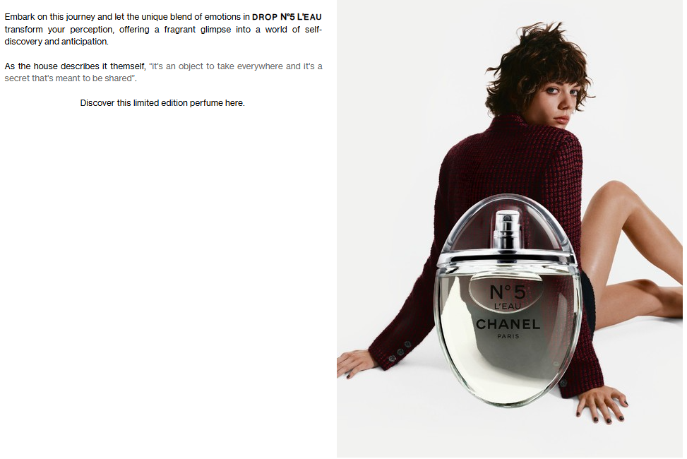 CHANEL LIMITED EDITION DROP N°5 L’EAUBy Odalisque / June 24, 2024 CHANEL LIMITED EDITION DROP N°5 L’EAU ← Travel with FLAERBackstage at Chanel Beauty Autumn-Winter 2024/25 Ready to Wear →
