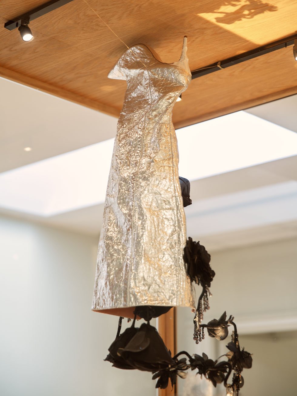 The centerpiece of the installation, “The Orante,”; features a finely crafted costume that includes a dress, a cape, and a halo-shaped headdress, which suggests a sacred symbolism while conveying a deeper personal meaning.