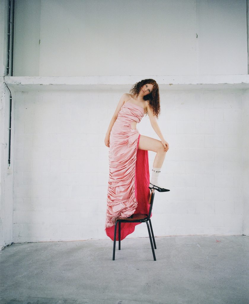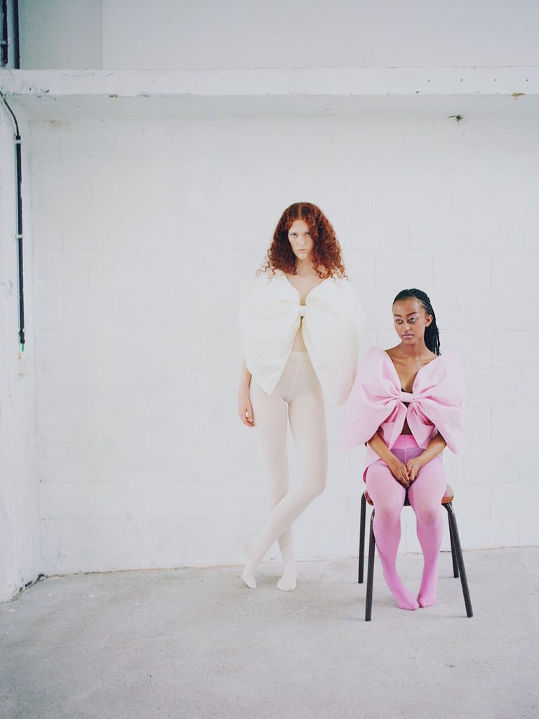 I have always been fascinated by the concept of girlhood and the images associated with it. Elements like ribbons, bows, and the colour pink are tied to Western girlhood. I have always liked these things, but for a long time, I felt like I shouldn’t enjoy and use them in my work, as they are often seen as frivolous and weak. Fashion and handcraft are powerful tools for constructing images of girlhood and different girlhood identities. They can also be powerful tools to subvert marginalised visions of femininity, such as girlhood, into a feminist context. This is something I finally wanted to explore in depth for my MA collection at the Royal Academy of Fine Arts in Antwerp.