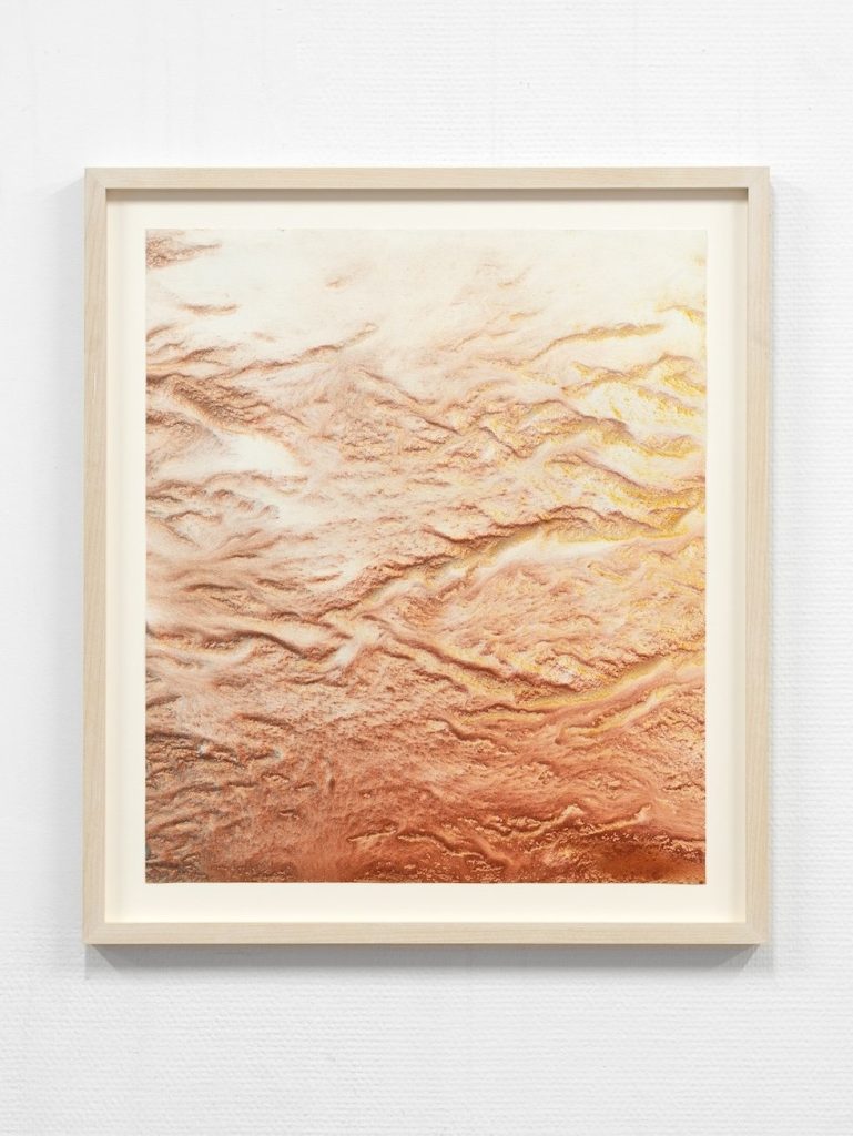 I constantly discover new directions and results within this process. One important discovery was when I started using slightly bigger grains of sand, which resulted in the contour of every grain becoming visible and imprinted on the paper. This is conceptually important for this series. When you see the works close-up they are very detailed – you can see how the grains gather as islands and how the water finds its way around the dunes. But seen from a distance this is not perceptible and instead other patterns and shades appear. It’s like each work is a universe in itself.