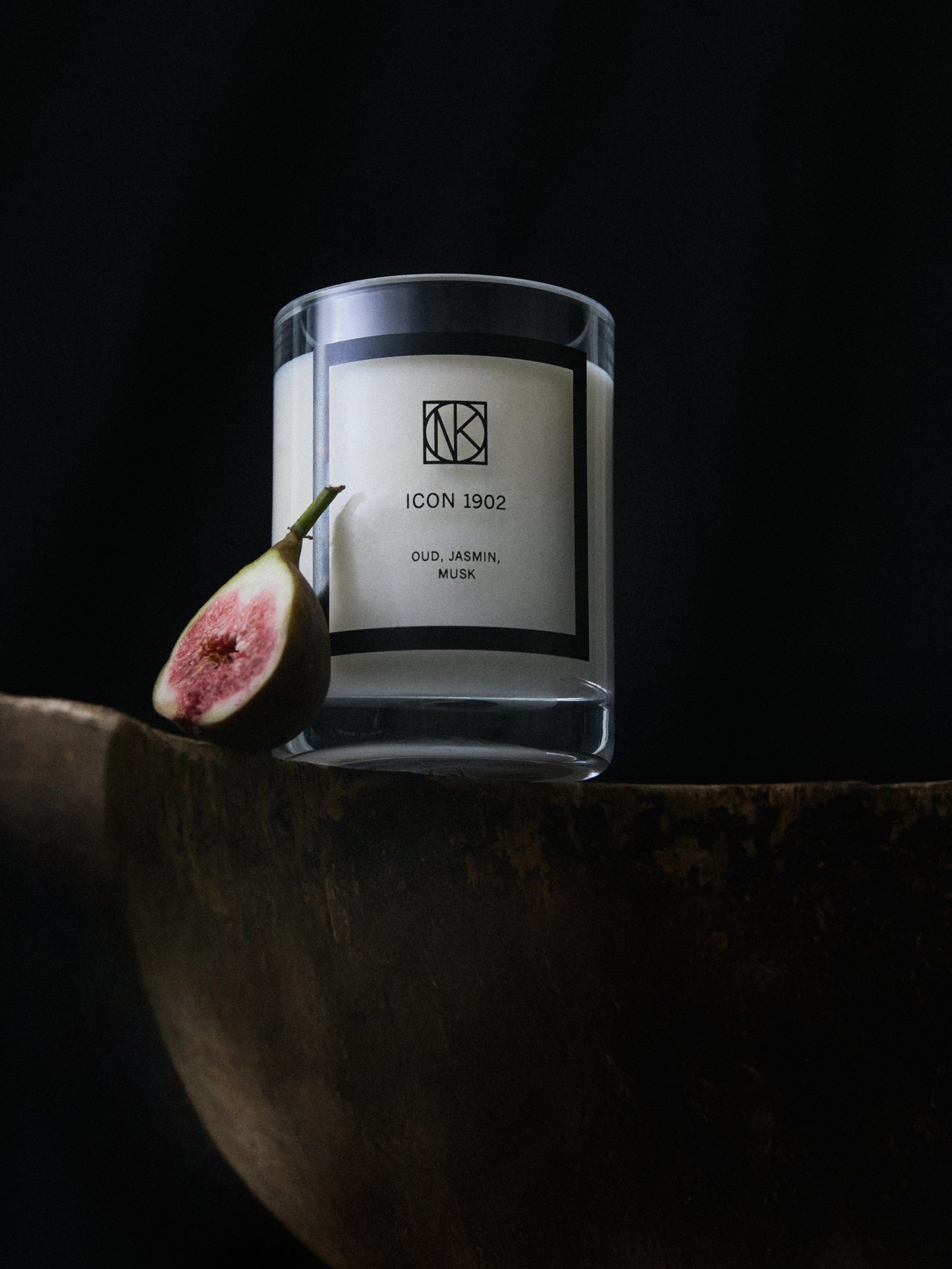 Icon 1902 by NK Collection The Icon 1902 candle from NK Collection celebrates the timeless elegance of NK’s heritage with a sophisticated blend of oud, jasmine, and musk. Encased in a patterned glass vessel inspired by archival NK designs, it’s a tribute to history and craftsmanship. Made in Sweden with paraffin-free soy wax and a pure cotton wick, this 300g candle offers approximately 60 hours of burn time, filling your space with a luxurious and evocative fragrance. Top: Oud Heart: Jasmine Base: Musk