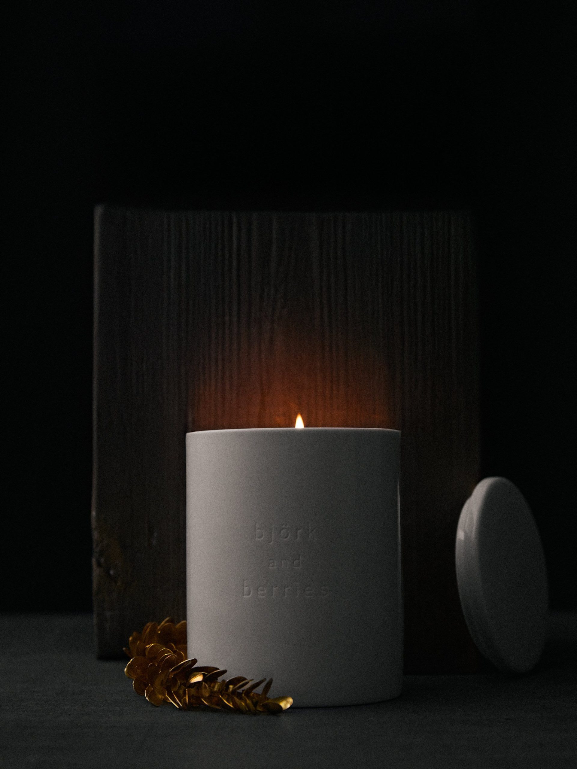 Fäviken by Björk and Berries Inspired by the rugged beauty of northern Sweden, the Fäviken candle brings the essence of the Fäviken farm to life. With top notes of fresh blueberry and bergamot, heart notes of geranium, cyclamen, and pine, and a rich base of smoky vetiver, cypress, and Tuscan leather, this fragrance captures the wild, serene landscapes of the gardens and forests that surround the farm. The perfect scent for those who appreciate the raw beauty of nature, it offers a warm and earthy atmosphere, ideal for cozying up during the colder months.