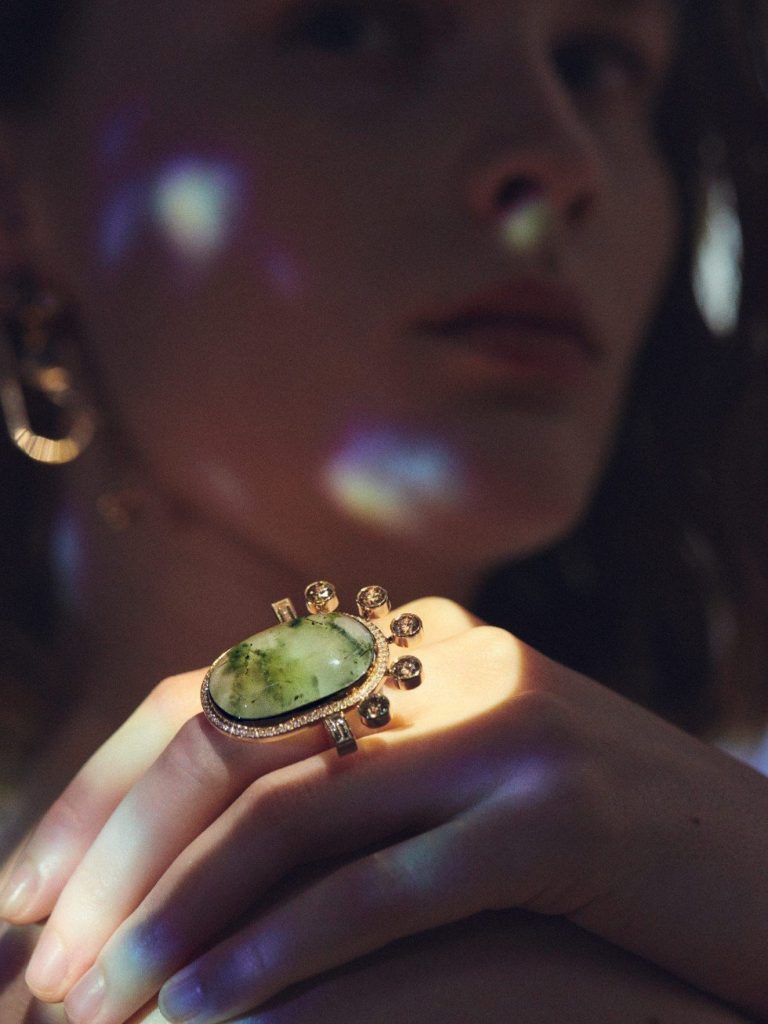 The collection’s palette is an understated yet impactful celebration of natural beauty, featuring gemstones like tourmalines, prehnites, sapphires, and moonstones, complemented by rose gold. These elements are chosen with precision to enhance various skin tones, underscoring Hermès’ commitment to universality and inclusivity.