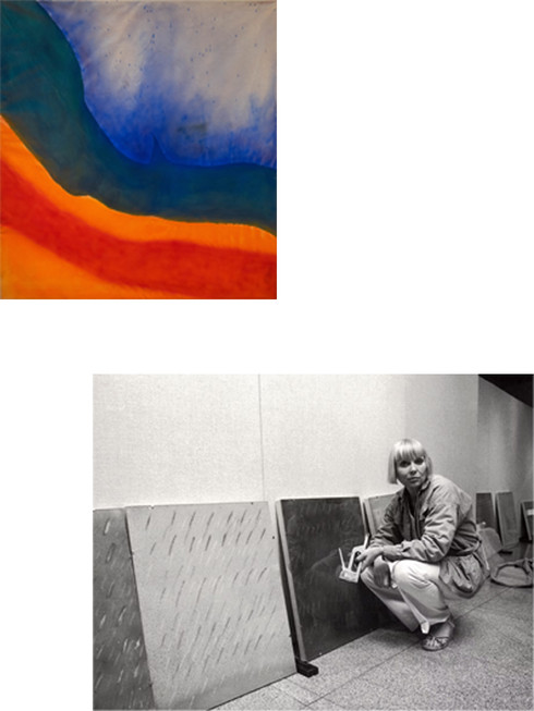 NM: Why did you choose to present the Colour Field and Buddhist Rain series, and what do they reveal about her evolution as an artist?