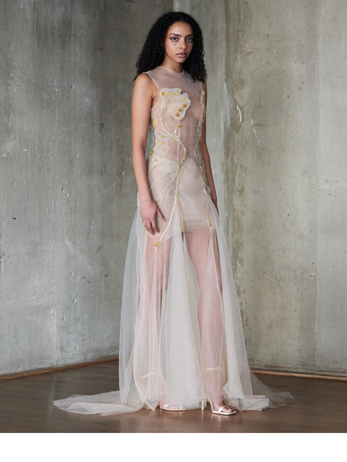 For example, I looked at how Art Nouveau book covers used symmetrical, botanical patterns, and translated that into laser-cut designs in gold silk, placed on mesh to give a two-dimensional “glued-on” effect. I also drew inspiration from