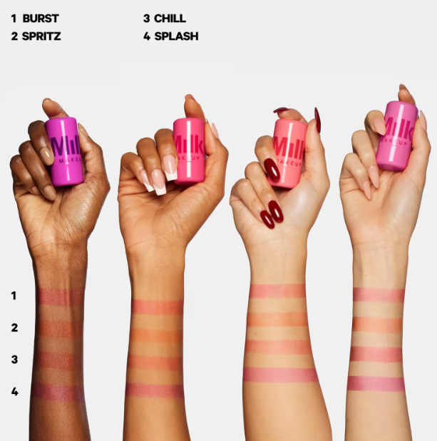 The tint comes in four vibrant shades: Burst (a poppy pink), Spritz (a coral orange), Chill (a juicy red), and Splash (a rich berry). Each shade is highly pigmented but can be built up or sheered out depending on preference, making it versatile for various looks. Users love the sheer, watercolor-like finish that delivers a natural glow while lasting all day, even through heat and activity. The formula is long-lasting, but it requires quick blending due to its fast-drying nature.