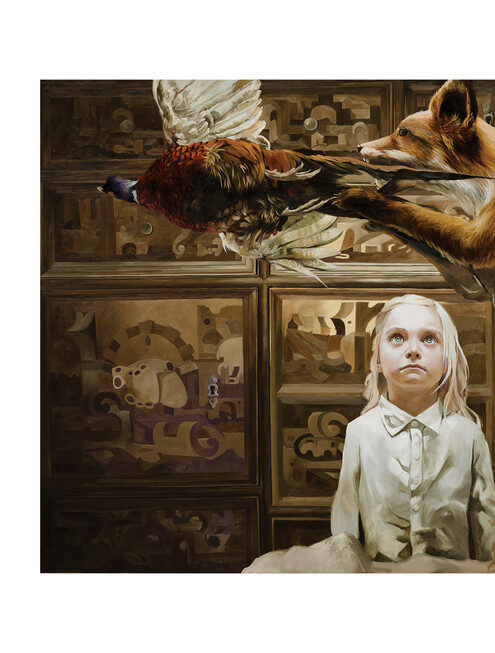 MÅ: When I painted The Room of Life and Death, I was drawn to the moment when a child first begins to comprehend the existence of death, not as an abstract concept, but as something tangible, something inevitable. There is an unsettling beauty in that moment, a paradox I wanted to capture. The girl in the painting stands still, gazing at the frozen hunt before her, a fox lunging at a pheasant, its jaws wide open, claws reaching. It is a scene full of tension, yet there is no real movement. The wooden panel behind them reveals the truth: these animals are taxidermy, lifelike, yet lifeless. This is not a hunt, but a display of one. And this is where the idea of illusion comes in. The child sees what looks like life, but in truth, she is standing in a room filled with death. There is something hauntingly beautiful about the way death can be preserved, its essence captured, almost admired. In many ways, this is a reflection of our own relationship with mortality. As children, we encounter death for the first time with a sense of wonder, perhaps even reverence. But as we grow older, we are taught to fear it, to push it away. This painting tries to capture that fragile, fleeting moment before fear sets in—when death is still just another mystery waiting to be understood.