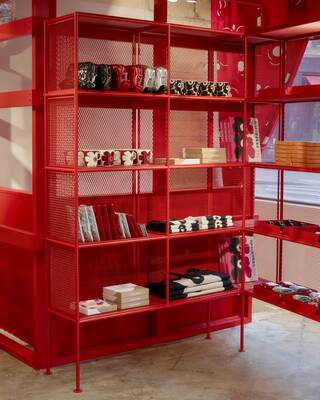 The store’s concept is an homage to Marimekko’s legendary textile printing factory in Helsinki. The interior has exposed structural elements, playful primary colours from printing screens, and industrial details such as painted metal railings and fabric carts. This unique environment provides the perfect canvas for the brand’s full lifestyle assortment, from ready-to-wear and bags to home decor.