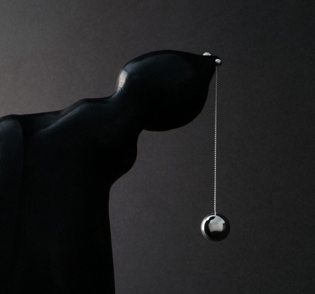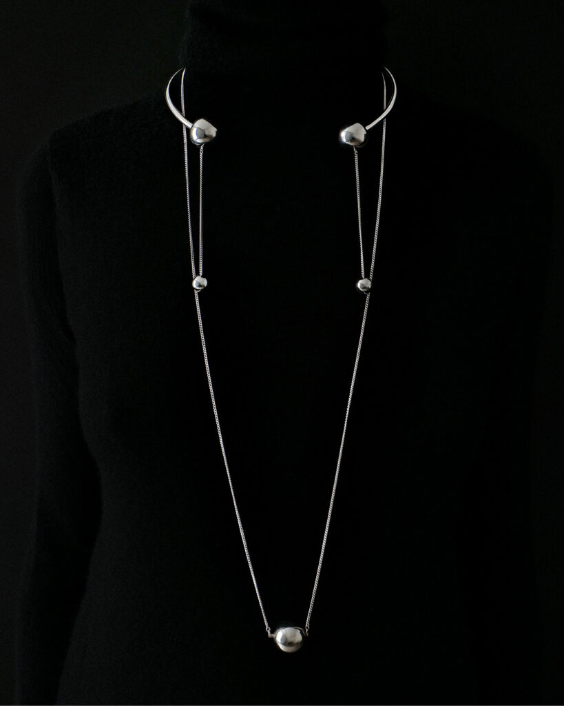 The resulting collection, Pendulum, includes necklaces, earrings, and a ring – all handcrafted in sterling silver. The sphere takes centre stage, with designs exploring form, balance, and proportion.