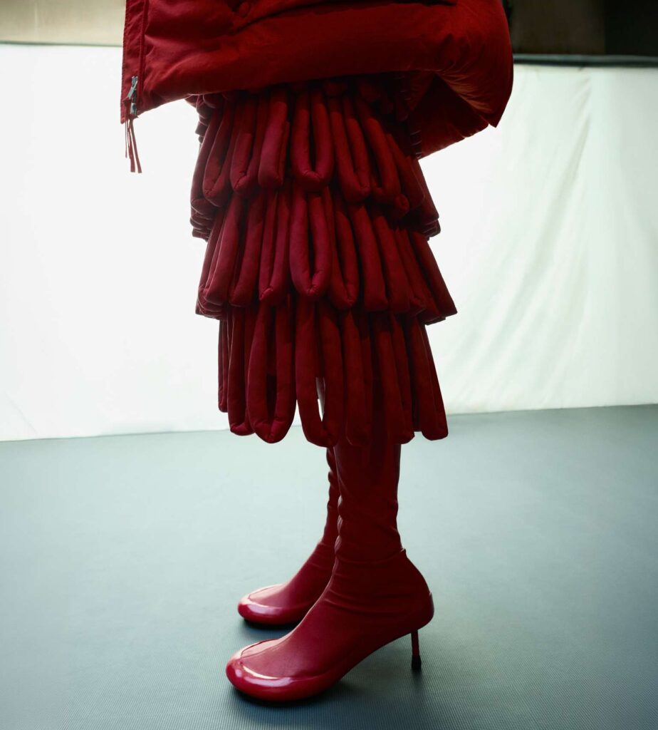 Voluminous outerwear, padded cardigans and dome-shaped skirts echo the curved forms of mountains and landscapes. A sculptural silver-tone pin, mirroring the outline of Moncler’s logo, offers a subtle signature detail. Natural fibres such as double wool, cotton twill and an innovative long-haired wool bring refined texture, layered with Moncler’s down-filled nylon for elevated warmth.