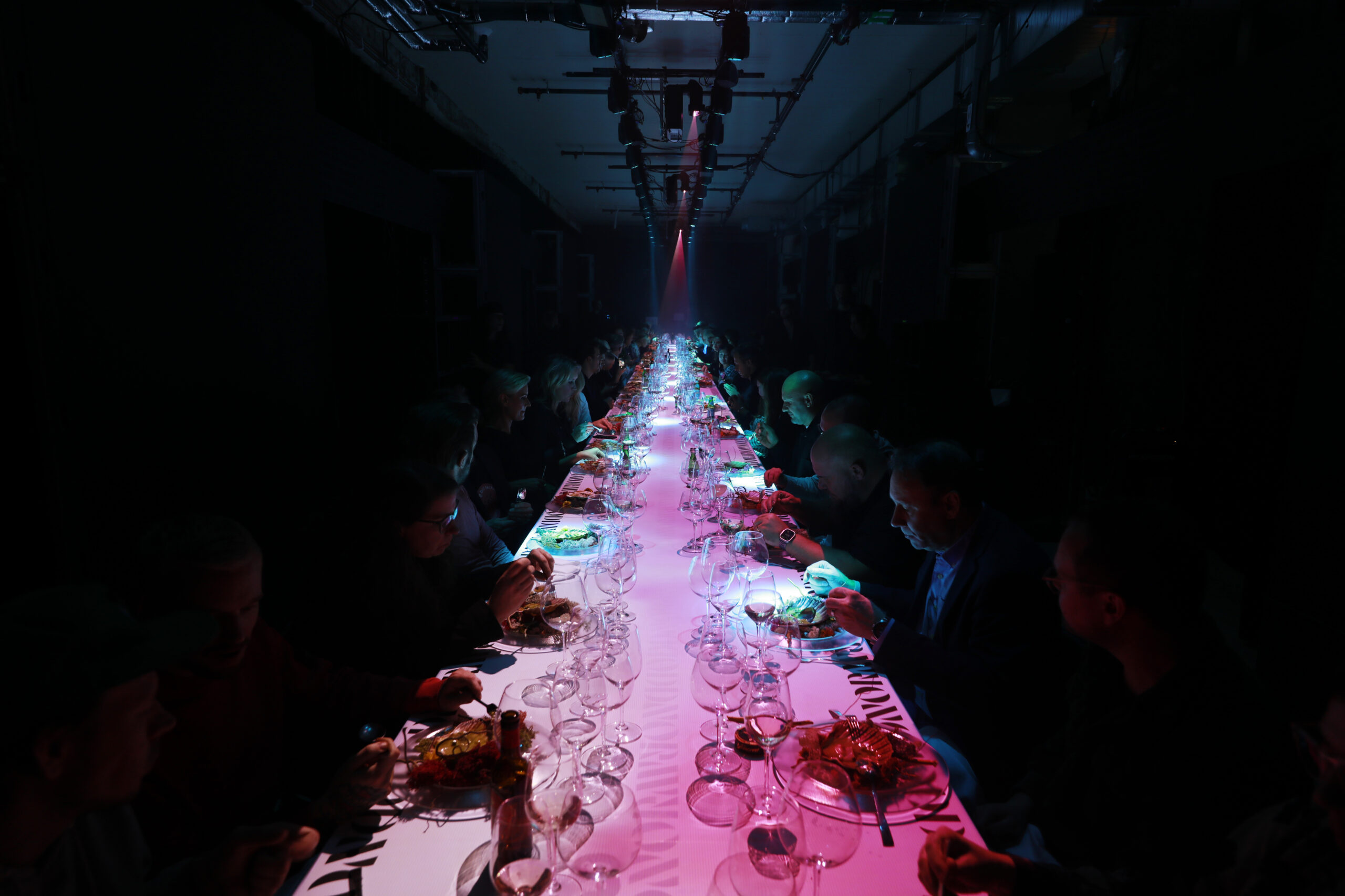 Each chair held a custom-designed pocket for cutlery, to be retrieved by the guest before each dish. The backs of the chairs featured specially designed holders for bottles of still and sparkling water, which were continuously refilled during the evening. From there, the evening escalated: video art washed across the walls, smoke drifted thick through the room, music pulsed, and a procession of exquisitely constructed dishes appeared, accompanied by thoughtful wine pairings.