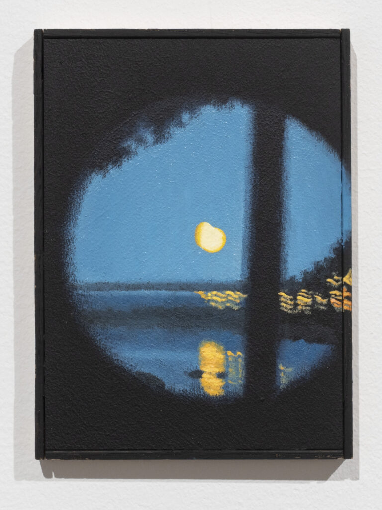 ND: The painting Blood (Moon) carries a lot of darkness. I usually cover the first black layer with the darkest shade of colour I can find in my motif. This one depicts a scene seen through a pair of binoculars, where the darkness surrounding what was seen through the lens was truly black, so I kept it. I think what interested me the most about this specific motif was the distortion, the element of unfocus, the lack of a determined border between light and darkness.