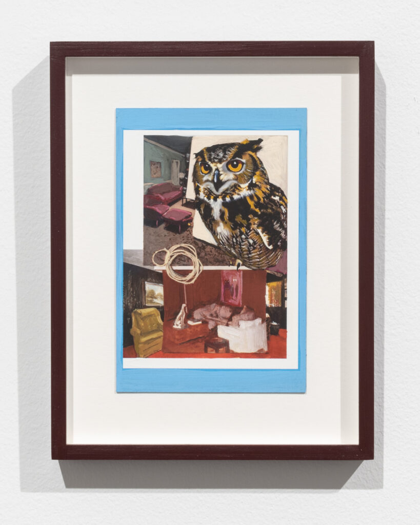 The composition combines photographs of middle-American domestic interiors with AI-generated imagery produced through a custom model trained on my own personal archive of memories. That merging of sourced and fabricated material parallels the process of making my hybrid totems, which similarly blur distinctions between found elements and constructed forms. The painting invites viewers to consider which components derive from lived memory and which are produced through technological processes, echoing the broader questions of how memory, material and culture intersect and shape one another.