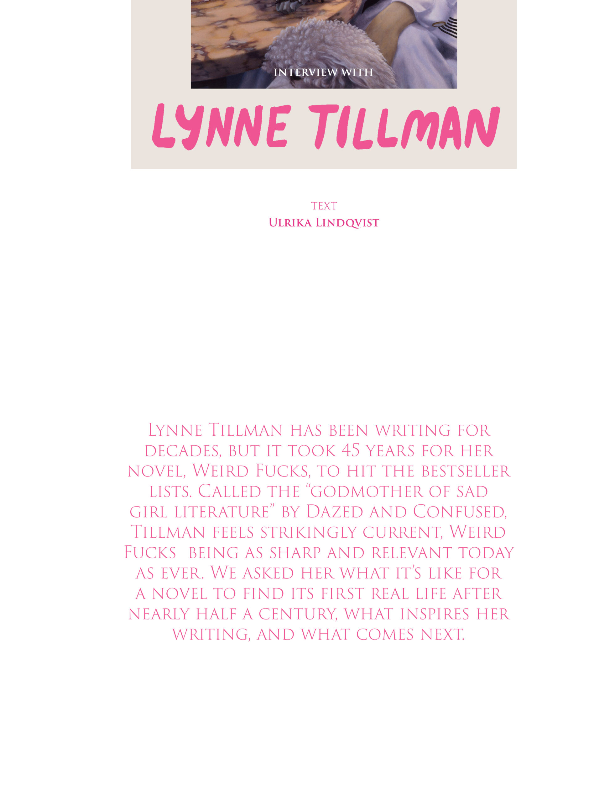 Lynne Tillman: In 1980, “Weird Fucks” was published in a pink magazine called BIKINI GIRL, edited by Lisa Baumgardner. Lisa and Bikini Girl were associated with Club 57, a punk place. Weird Fucks, in manuscript was 62 pp in manuscript but it was printed in 7 pt type on very wide pages, so it almost disappeared in the mag. Very disappointing. It didn’t circulate well, maybe 500 or 1,000 copies. No one really saw it. So I’d say it wasn’t published, in a way. I gave readings from it, so if people knew about it, that’s how, and not from reading it themselves. Other people did artist or limited editions, I’d call them; Jim Haynes did one from Paris. Again, no visibility or distribution in the usual sense. In New Her- ring Press (2014), a small, indie press, published it in its correct form, that is, with a few changes I made. Artist Amy Sillman did the amazing cover and all the illustra- tions – a beautiful book, but again in a limited edition. So, there was little to no response to Weird Fucks until Peninsula Press published it in 2022. Oddly, it became a bestseller, which amazed me. Then responses came, reviews, social media, emails, the lot of it. Artist Hilary Harkness’s cover, based on her Stein/Toklas series of paintings were also amazingly helpful to the book. Wild and fascinating and gorgeous.