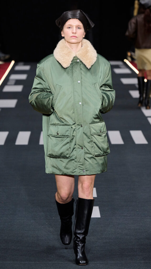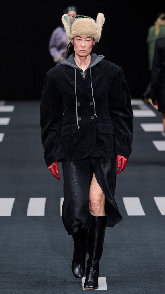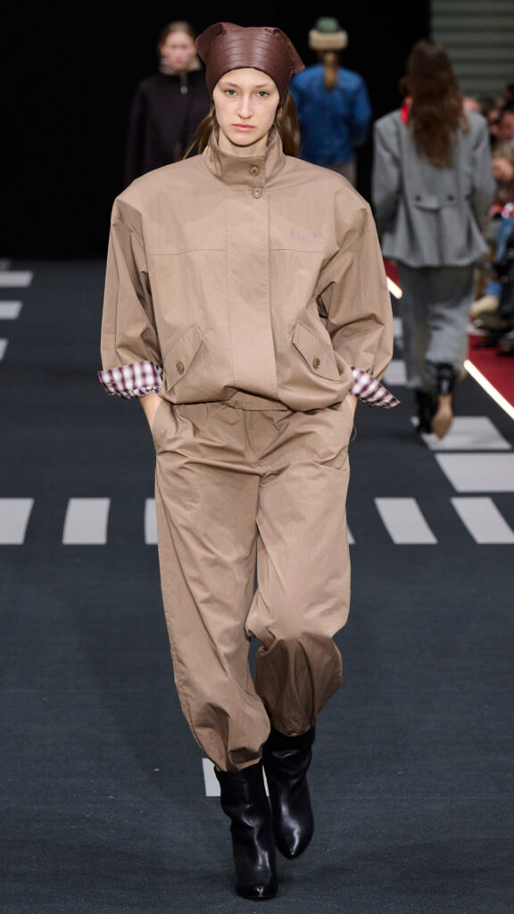 Presented during Copenhagen Fashion Week, the Airborne collection was shown in a historic sports hall transformed into a runway-inspired catwalk. Accompanied by the Sankt Annæ girls’ choir, the show carried a ceremonial atmosphere that reinforced the collection’s aviation-driven narrative.