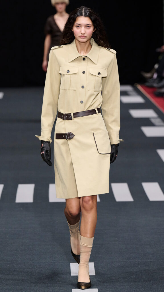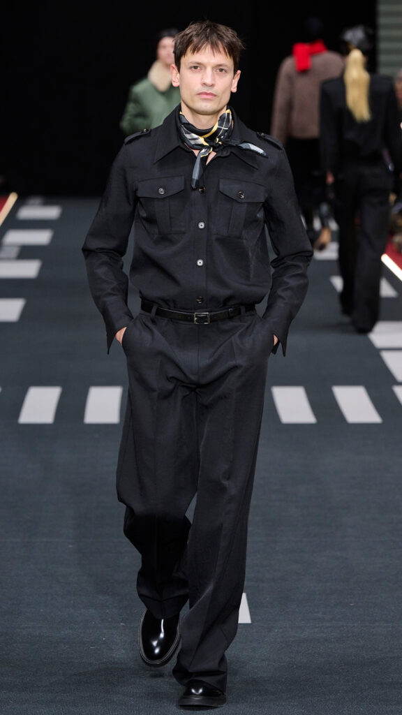 The collection explores contrasts between function and elegance: aviator jackets, uniform shirts, distressed leather and structured denim are balanced with flowing dresses, lace details, lightweight fabrics and floral prints. Strength and protection meet softness and sensitivity through expressive silhouettes and refined details.