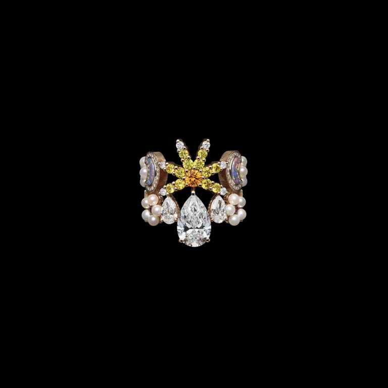 Comprising fifty seven exceptional pieces, the collection unfolds as a celebration of Dior’s identity, blending dreamlike imagination with extraordinary craftsmanship. Among its most striking creations is the Soleil Céleste set, a tribute to Christian Dior’s fascination with divinatory arts. Yellow diamonds, radiant stars, and crescent moons carved from black opal doublets and set on turquoise form a dramatic bib necklace, complemented by a ring, earrings, a transformable bracelet, and a brooch that doubles as a hair accessory. Each piece evokes talismanic symbols of destiny and wonder.