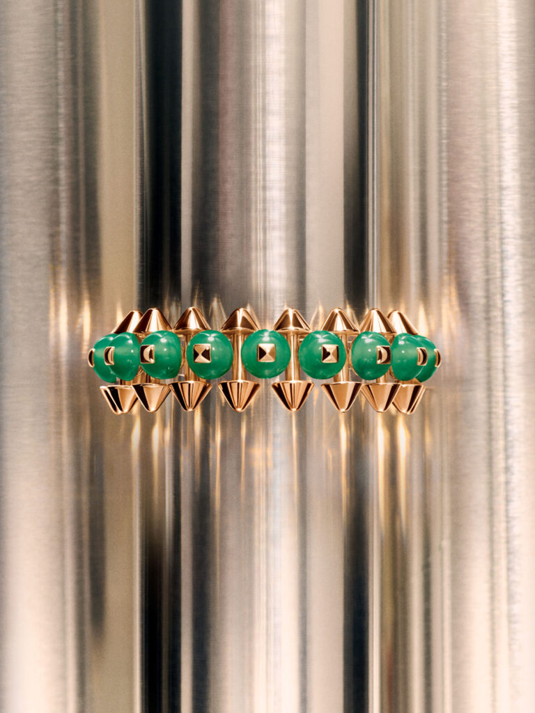Color and scale take the lead. Red‑dyed agate, green‑dyed agate, pink chalcedony and onyx bring new dimension to the collection’s architectural mesh, while extra‑large volumes heighten its bold, tactile character. Hard‑stone beads, precisely graded and aligned, are secured with clou de Paris nails. A complex construction that doubles the components of gold‑only designs.