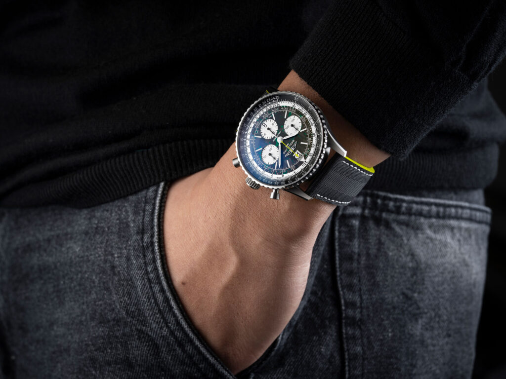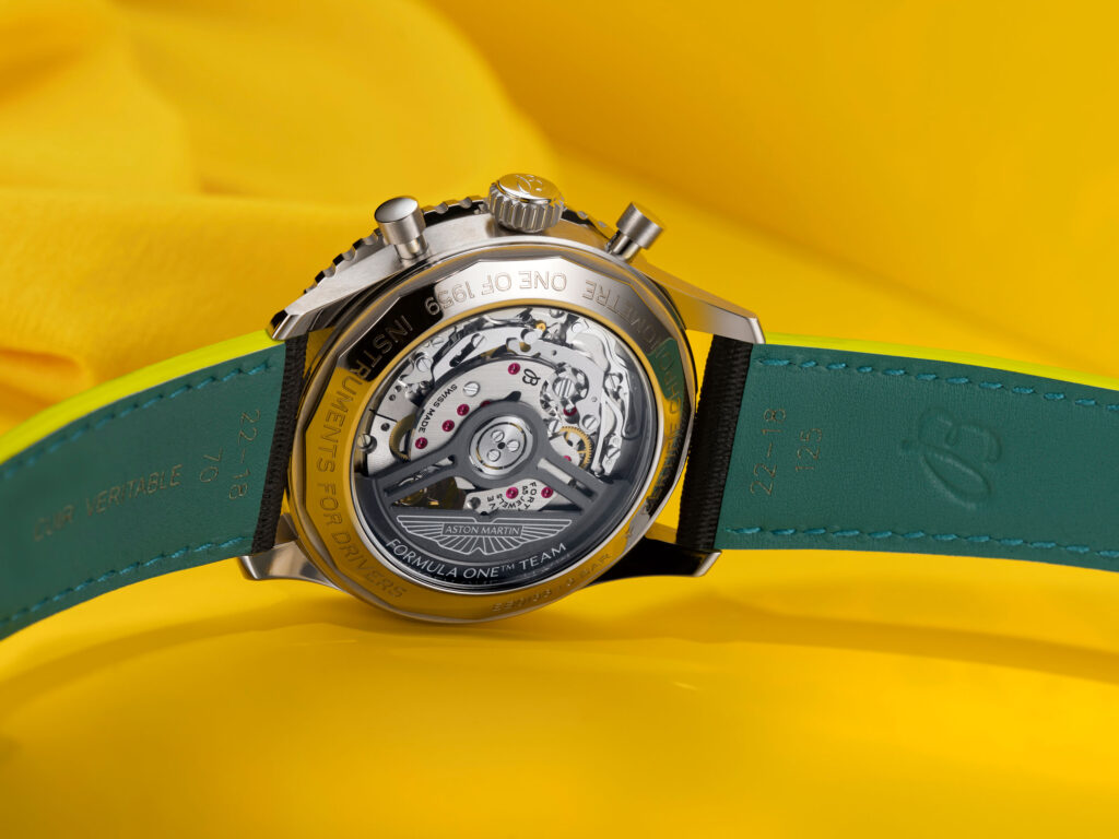 The Navitimer B01 Chronograph 43 Aston Martin Aramco Formula One™ Team reflects that alignment. Limited to 1,959 pieces, it carries Aston Martin Racing Green with lime accents from the team’s livery. A lightweight titanium case, the first on a Navitimer, meets a carbon‑fiber dial inspired by the cockpit of an F1® car. A textured leather strap recalls a racing harness, while enhanced nighttime visibility keeps the watch legible under pressure.