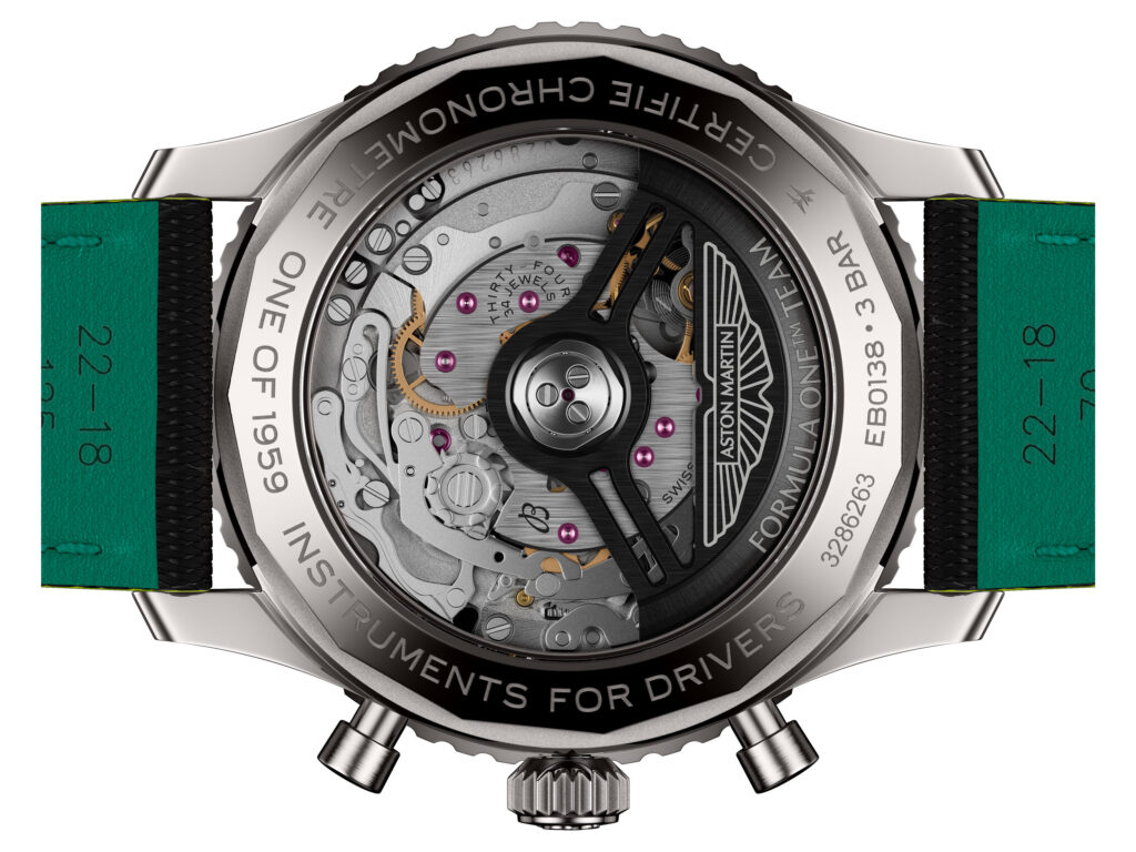 Through the open sapphire‑crystal caseback, the Breitling Manufacture Caliber 01 reveals its COSC‑certified precision, complete with a matte‑black tungsten rotor created for this edition. Engravings mark the series: “One of 1959” and “Instruments for Drivers.”