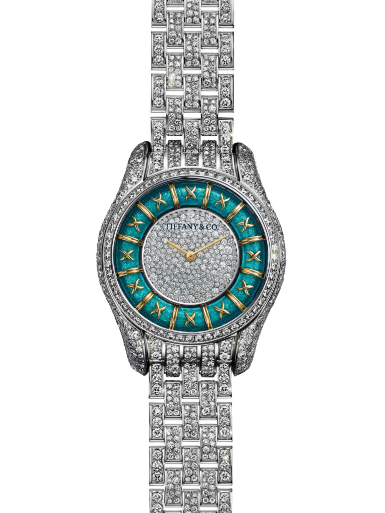 Matching alligator straps in Tiffany Blue® or white complete the piece, while a high‑jewelry version pairs the enamel with a full pavé bracelet in 18k white gold.