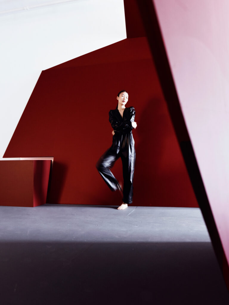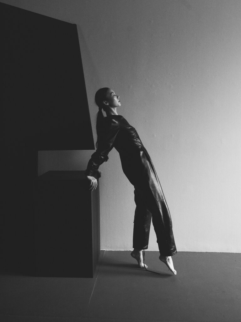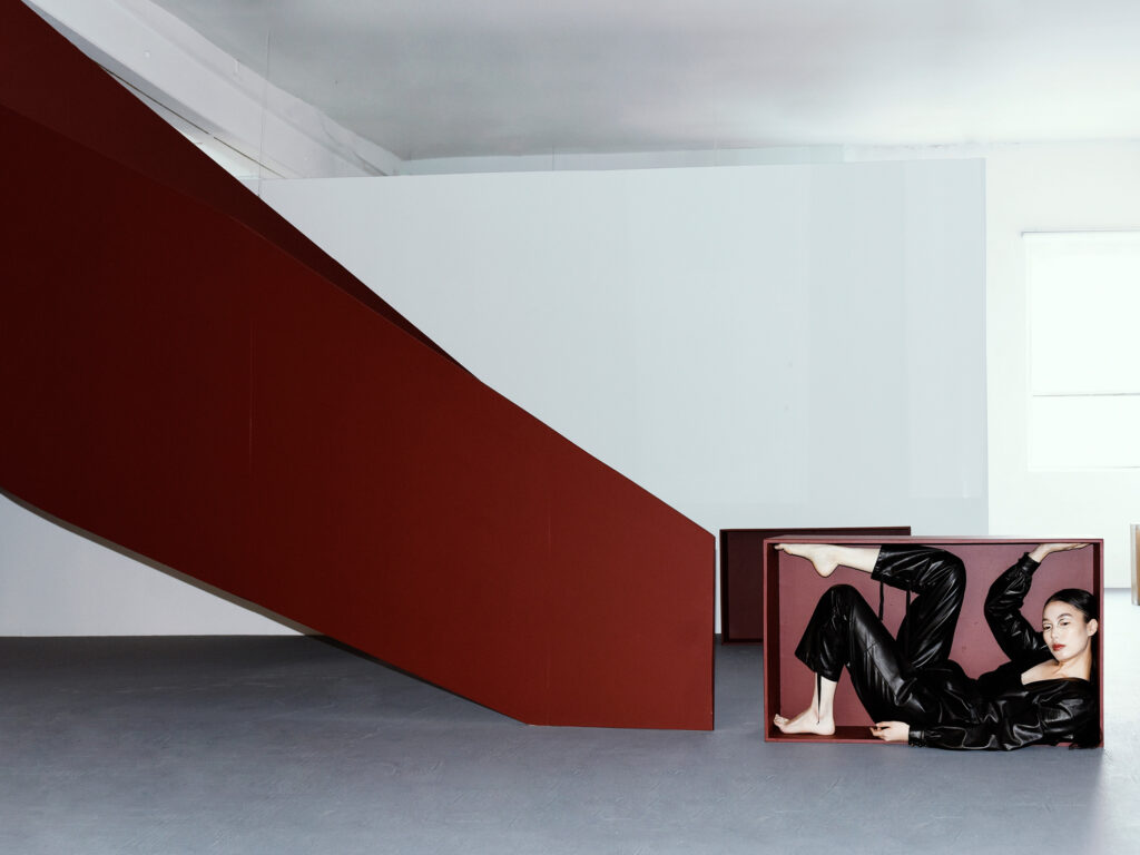 This recent photoshoot made this intersection visible. Several of the artists I collect are represented by Proxyco Gallery in NYC, where in a recent installation , I used as the backdrop a 1/2-scale simulacrum of a habitable sculpture by artist and architect Pablo Gómez Uribe. Its structural clarity and spatial discipline echoed the leather edition pieces, reinforcing the dialogue between architecture, art, workwear, and tailored form.