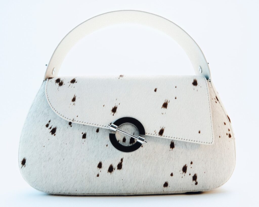 We developed the HERØ in recycled leather, Italian polido skins, distressed finishes, and a dotted hair-on-cow leather, which is the most directional interpretation. The polished leathers feel precise and architectural, while the distressed leather version brings edge and character. The hair-on-cow introduces texture and depth, and it connects directly to a statement outerwear piece in the ready-to-wear collection.
