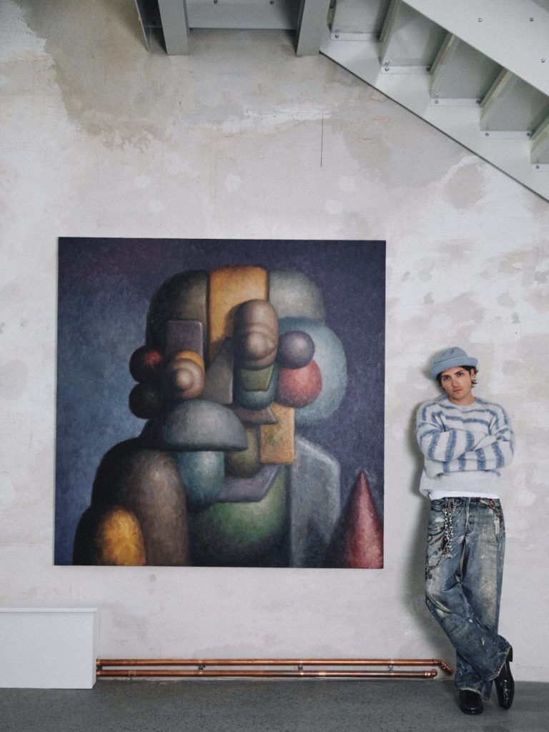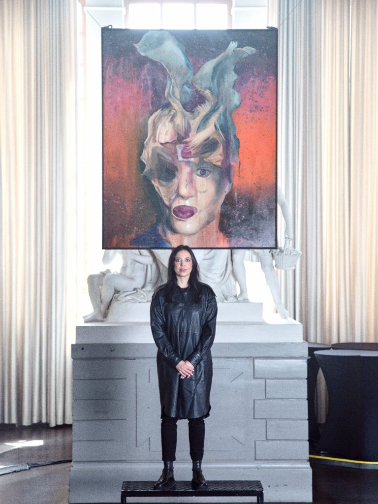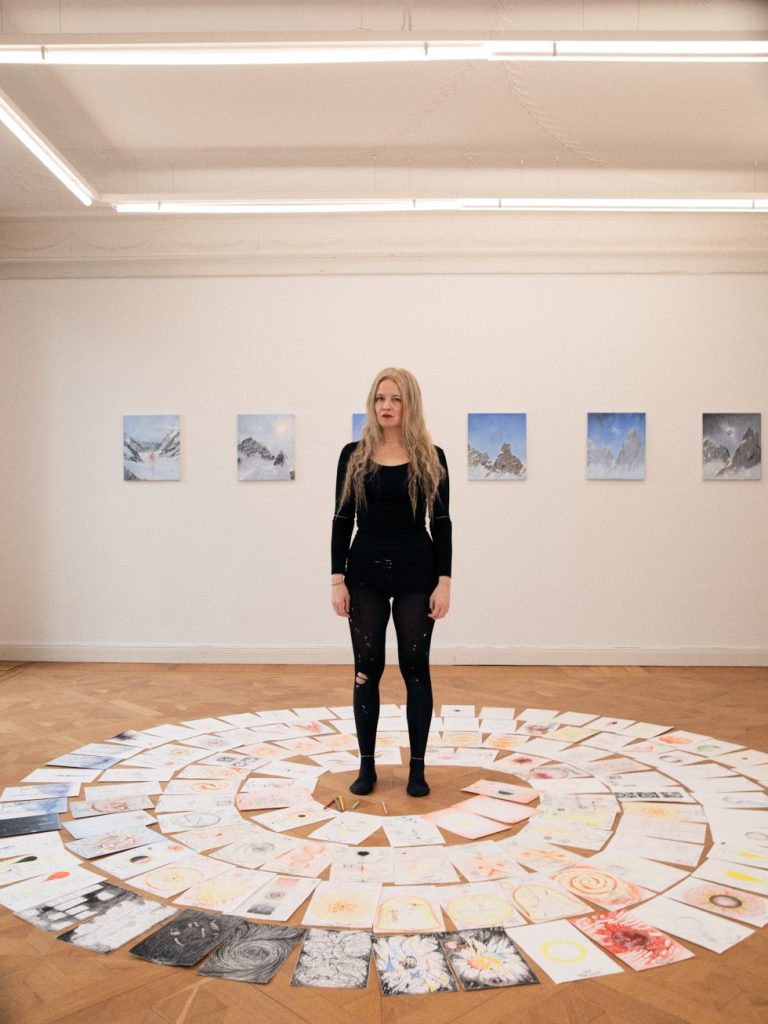 Everything I Do, Every Step I Take, Has to Be Connected to Reality. A Conversation With Ylva Snöfrid. text Astrid Birnbaum Photography Sandra Myhrberg Known for her innovative blend of painting and performance, Ylva Snöfrid has captivated audiences worldwide with her unique exploration of existential themes. Her works are deeply introspective, often drawing on historical motifs to delve into the human experience. Her current exhibition, part of the Cosmos Vanitas series, is titled Jungfraujoch – High Altitude Paintings and is showcased at CFHILL in Stockholm. It takes us to Jungfraujoch, the second-highest viewing point in Europe, where Snöfrid’s artistry melds with the breathtaking elevation. The resulting celestial maps chart the intimate terrains of human existence. Central to Ylva’s work is the theme of ‘Vanitas’, reflecting on life’s transience. Her paintings don’t just depict this; they embody it, with each brushstroke and colour choice resonating with the vibrancy of life amidst change. Ylva, I would like to begin at the beginning. Looking back, what first inspired you to pursue a career in art?I think I understood very early that I was an artist. My parents were also making art, even though they had ordinary jobs. They lived like artists. Even though my childhood was a struggle in many ways, they were very supportive of me making things. There are specific moments from my childhood when I realized I was an artist. One was when I was around six and I made some drawings of the queen from Elsa Beskow’s Midsummer tale. The queen was helping the wild weeds and the flowers to get together to have a party. The tale is about a girl who falls asleep and sees the world of these plants. I tried to make a portrait of her, but I couldn’t manage to draw her like Elsa Beskow. I was so disappointed with myself. It was such a struggle, and I could not stop. It was more important than many other things in my life at that moment. Part of my life as an artist began during my childhood. I had a mirror twin who lived behind the mirrors, named Snöfrid, while I was Ylva. I wrote a poem about her as a child, and she gradually became more real, embodying my artwork. Once, I created her as an alcoholic beverage that I distilled on paintings for an installation, inviting people to ‘drink’ her. During interviews, she accompanied me and even answered questions. Consequently, some interviews featured Ylva, Snöfrid, and the interviewer. Unable to rid myself of her presence, I eventually created a life-sized doll with my proportions. When my family and I moved to Athens, I felt the need to take the next step in my artistic practice, necessitating a transmutation. This eight-hour ritual, performed through a mirror, was part of a show in Montpellier curated by Nicolas Bourriaud. I sat on paintings, inviting the audience to participate. In a small tent, I conducted the actual ritual, meeting Snöfrid in the mirror. I painted my vagina on small paintings and invited people to sit down, serving her—us—on these paintings. Through this process, I abandoned my surname and became Ylva Snöfrid, uniting us as one. We are now physically connected all the time. I wear gold joints—gold jewellery around my waist, wrists, neck, and fingers—gradually covering my entire body. These joints symbolize our connection and frequently appear in my paintings. The use of gold has multiple reasons. In my childhood, within an anthroposophic environment, I received gold injections to strengthen my sense of self and create a boundary between the outer and inner worlds. I administered these injections myself into my belly. Your current exhibition, ‘Jungfraujoch – High Altitude Paintings,’ shown at CFHILL, takes us to the heights of the Swiss Alps. What drew you to this remote location?In my artistic practice, I have always worked with my own life and body as the foundation for my artwork. My approach is highly subjective and intuitive, building on my personal experiences. I have explored themes from my own childhood to motherhood, including significant events like giving birth. For instance, my father was a heroin addict during my childhood, and this profoundly influenced my paintings and overall artistic practice. For me, art must be as real and tangible as the ordinary reality I perceive. In the five years before starting the project that culminated in this exhibition, I lived in Athens with my family. In Athens, I created a secluded artwork that was essentially a home, complete with furniture and paintings. We slept on paintings, we ate on paintings. This immersive experience prompted me to look beyond the confines of this project and explore the external world in a more existential manner, recognizing that I live on Earth, a planet that offers a broader, planetary experience. This exploration extended to the cosmos and my connection to the world on a larger scale. As part of this study, I created three monumental paintings, “Cosmos and Vanitas,” each 7×6 meters high, which are installed in Lund. This project involved visiting various places to explore the connection between mass and atmosphere. My husband, Rodrigo, discovered the Jungfraujoch research station, situated at an altitude of 3,500 meters. It is one of the highest research stations globally, attracting researchers from around the world. Rodrigo applied on my behalf for the opportunity to stay there. Therefore, I went up this high mountain. How did the environment of Jungfraujoch affect your creative process?I went there thinking I was going to do a study on the atmosphere and mass. But I didn’t really think that it could affect me physically. When I arrived, a whole other process started within myself, inside my body. The first thing I felt was this very high pressure on my brain. Later, my eyesight improved dramatically because my eyeballs actually adjusted to the pressure. I felt very bad physically. I started to get high altitu
